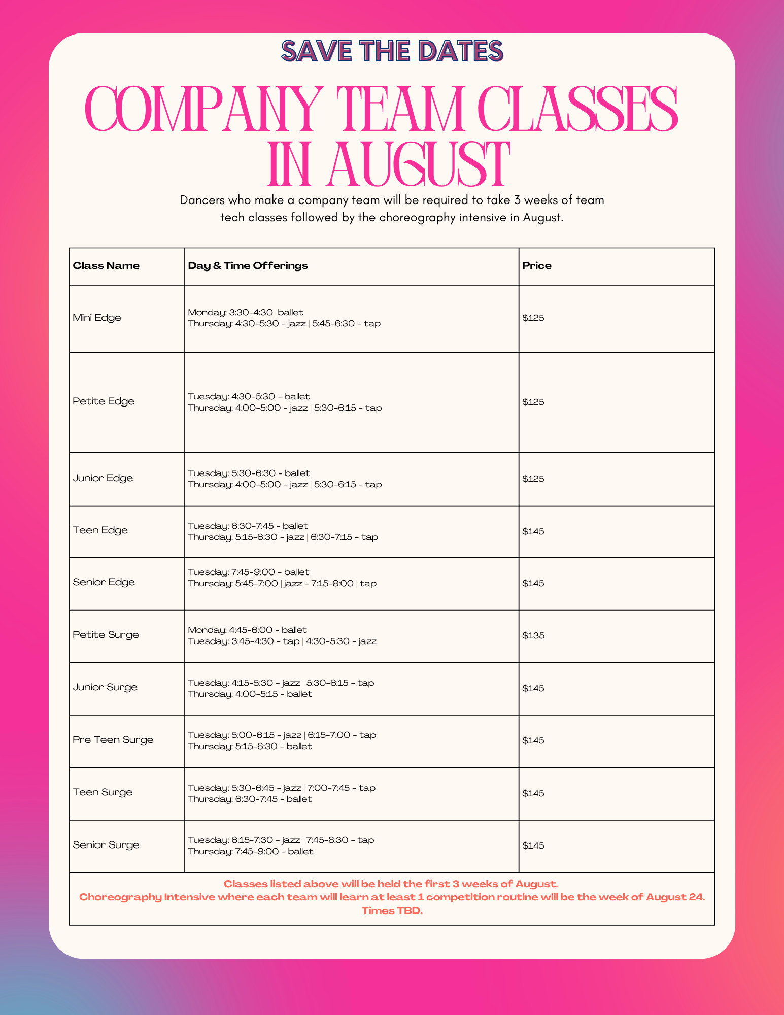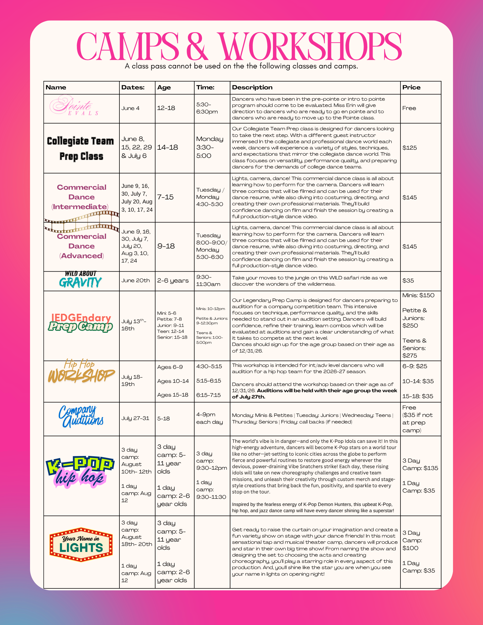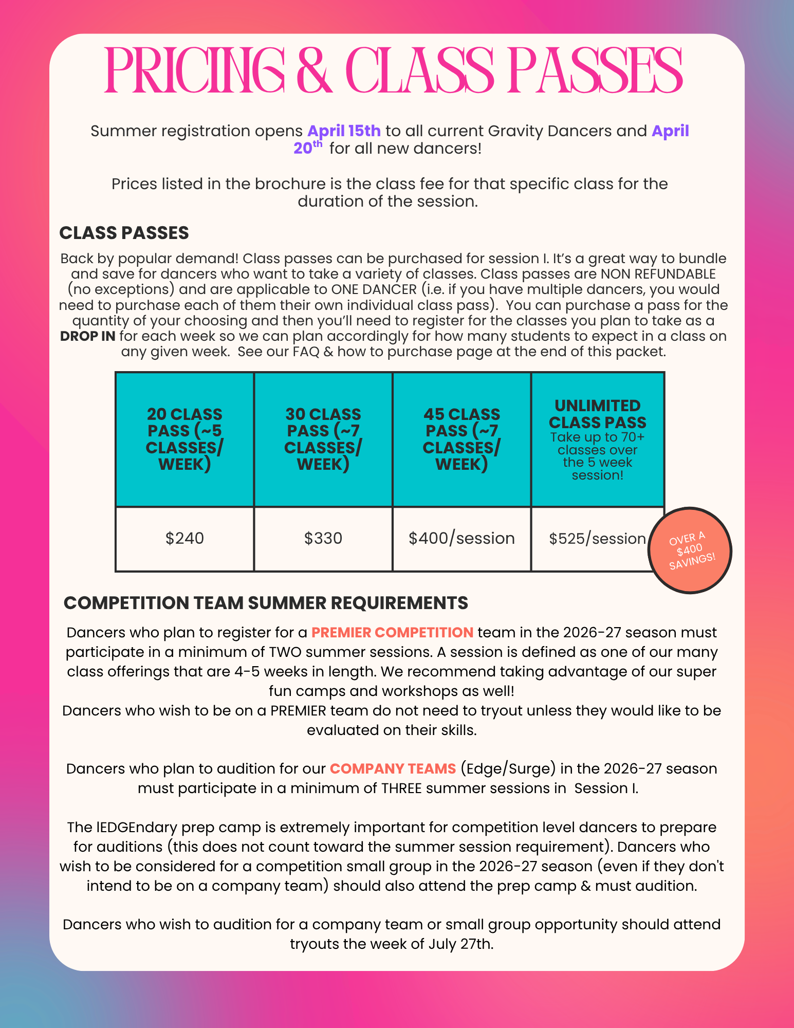 COMPANY TEAMS: Our Edge & Surge Teams are available for dancers who will be entering into K-12th grade in the 2026 school year. Dancers must audition to be considered for a company team and must also take at least THREE summer classes in Session I and attend the Legendary Prep Camp in July. At the prep camp, dancers will learn all skills and audition combos for their audition.