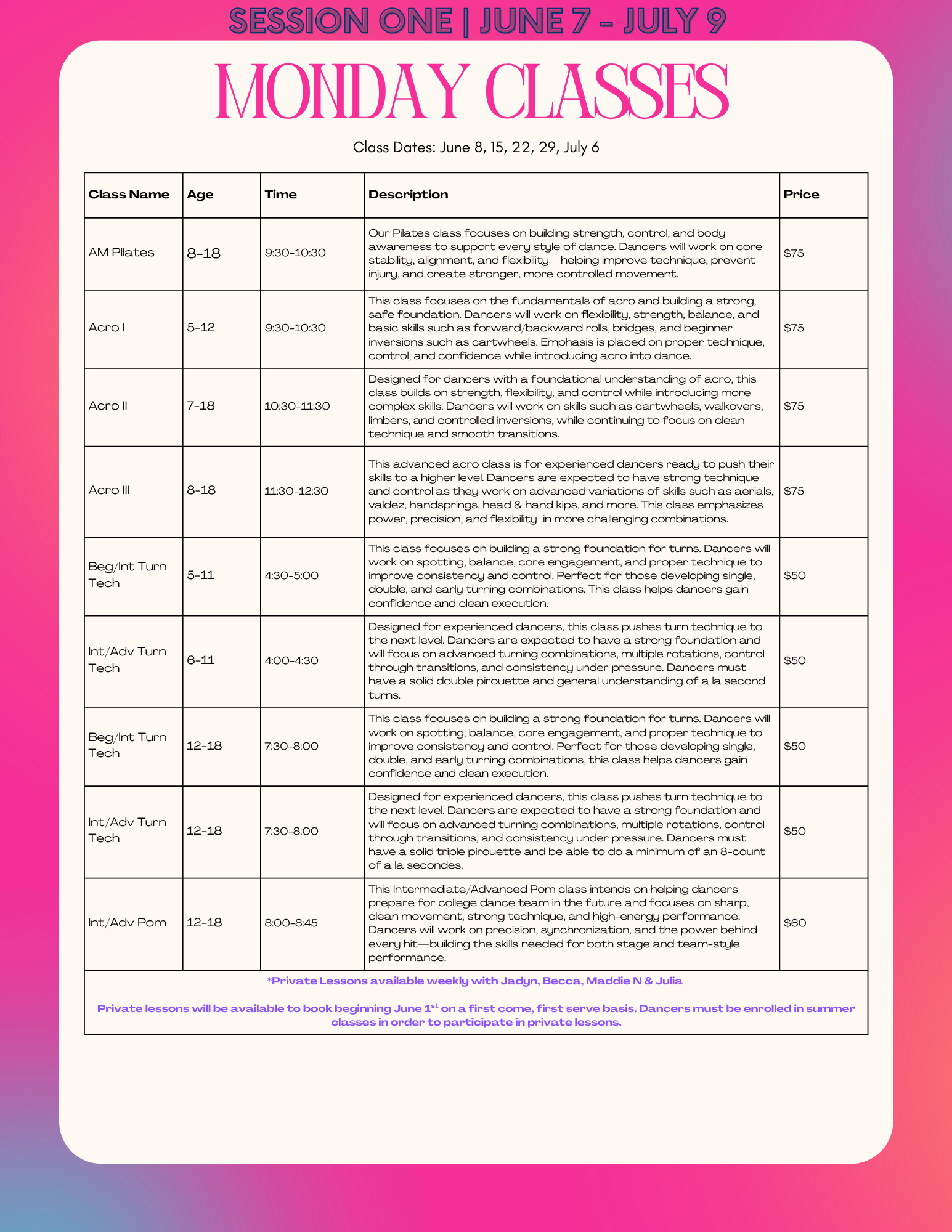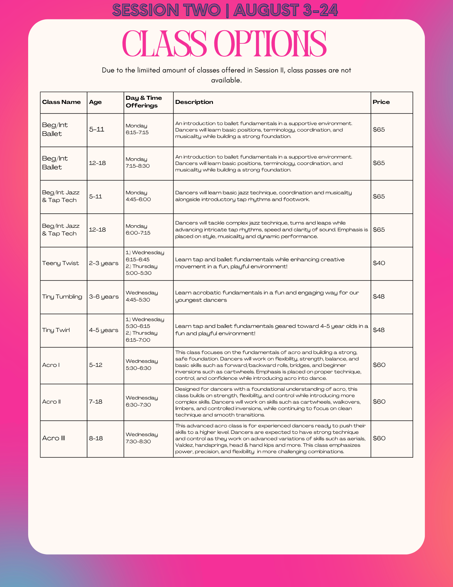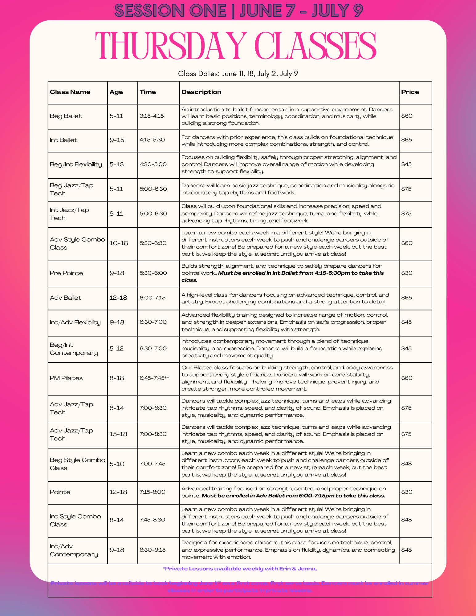 CLICK HERE TO VIEW OUR MUST UP TO DATE LIST OF SUMMER DANCE CLASSES.